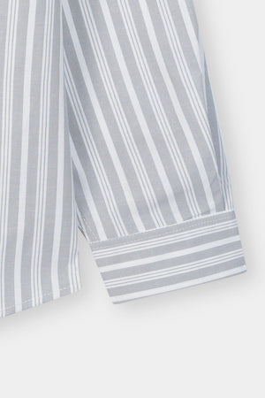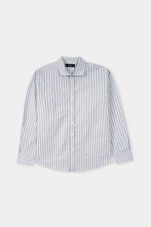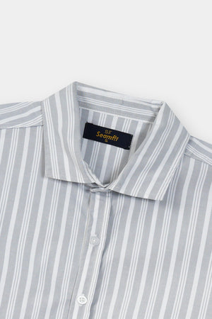 This full-sleeve shirt combines semi-formal and casual styles, crafted from 100% cotton for breathability and comfort. Featuring a classic striped pattern in grey and white, it offers a regular fit that ensures a polished yet relaxed look suitable for various occasions. Ideal for those seeking versatile wardrobe essentials with a refined touch.