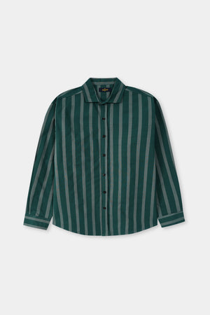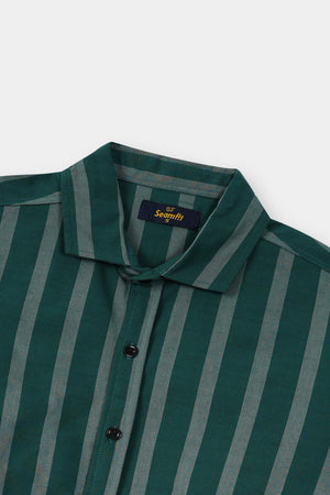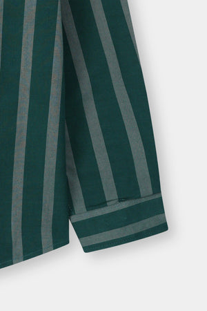 This full-sleeve shirt combines semi-formal and casual styles, crafted from thick cotton fabric for durability and comfort. Featuring a green striped pattern and a regular fit, it offers a polished yet relaxed look suitable for various occasions. The breathable material ensures all-day wearability, making it a versatile addition to your wardrobe.