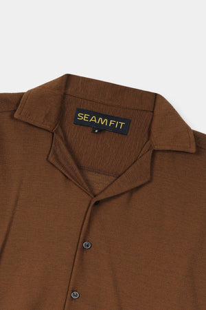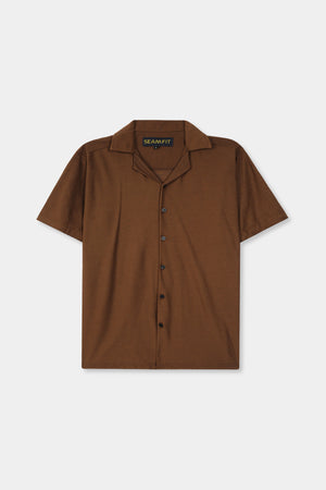 This mid-brown half-sleeve shirt features a distinctive coat collar combined with a relaxed Hawaiian style, crafted from stretchable cotton lycra fabric. Designed with a regular fit, it offers both comfort and flexibility, making it ideal for casual wear while maintaining a polished look. The breathable material ensures ease of movement and durability throughout the day.