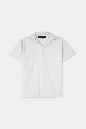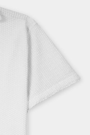 This half-sleeve shirt features a distinctive coat collar combined with a Hawaiian style, crafted from white textured cotton lycra fabric. The stretchable material ensures comfort and ease of movement, while the regular fit offers a balanced silhouette suitable for various occasions. Ideal for those seeking a blend of classic structure and relaxed tropical flair.