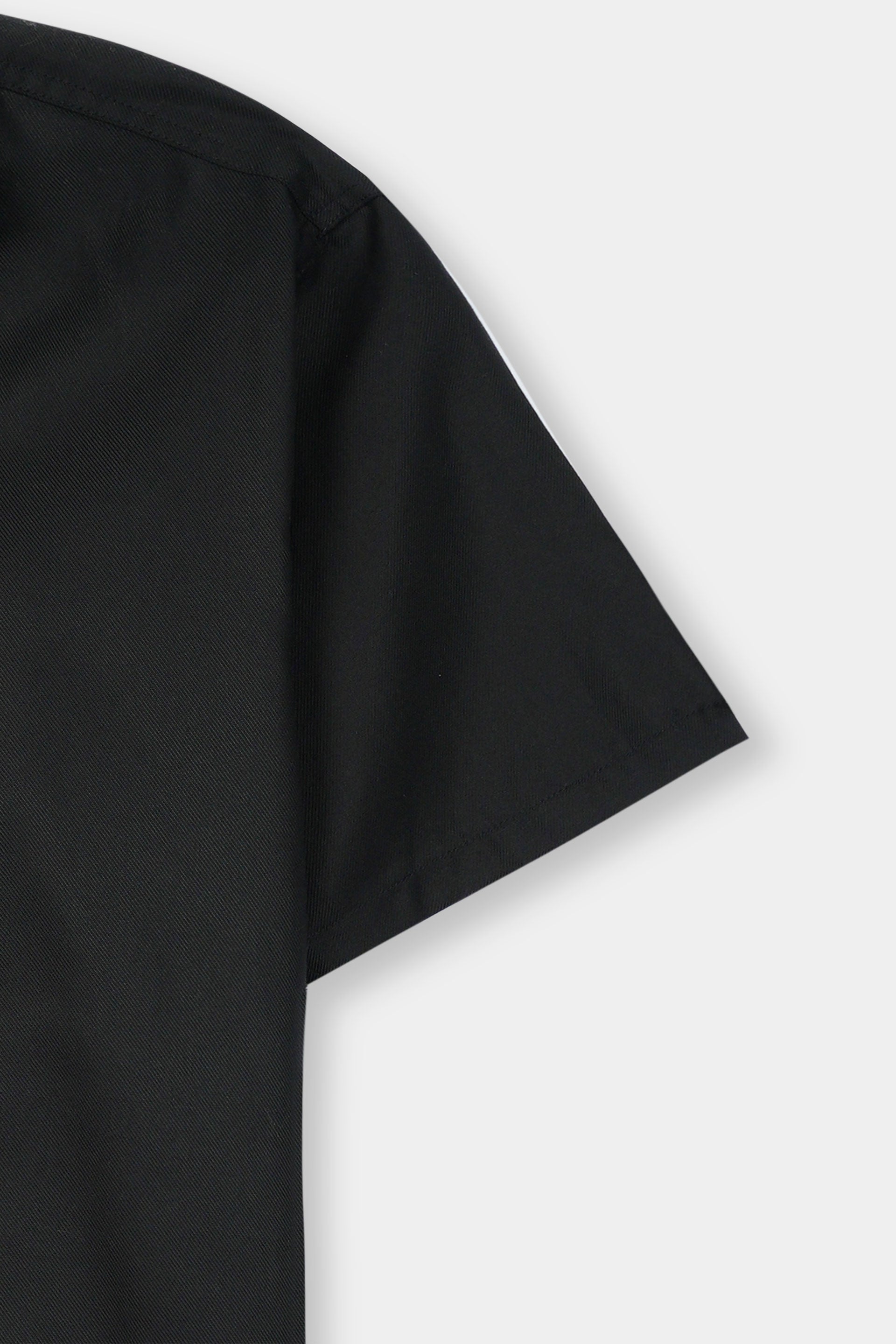 This slim-fit half-sleeve shirt features a distinctive coat collar combined with a Hawaiian-inspired design, crafted from pure twill cotton in jet black. The fabric ensures durability and comfort, while the tailored cut offers a sharp, modern silhouette ideal for both casual and semi-formal occasions.
