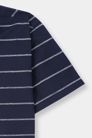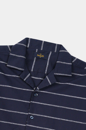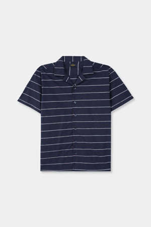 This half-sleeve shirt combines a classic coat collar with a relaxed Hawaiian style, crafted from pure cotton for breathability and comfort. Featuring navy blue stripes and a slim fit design, it offers a modern silhouette that enhances your look while ensuring ease of movement. Ideal for casual or smart-casual occasions, this shirt balances style and comfort effortlessly.