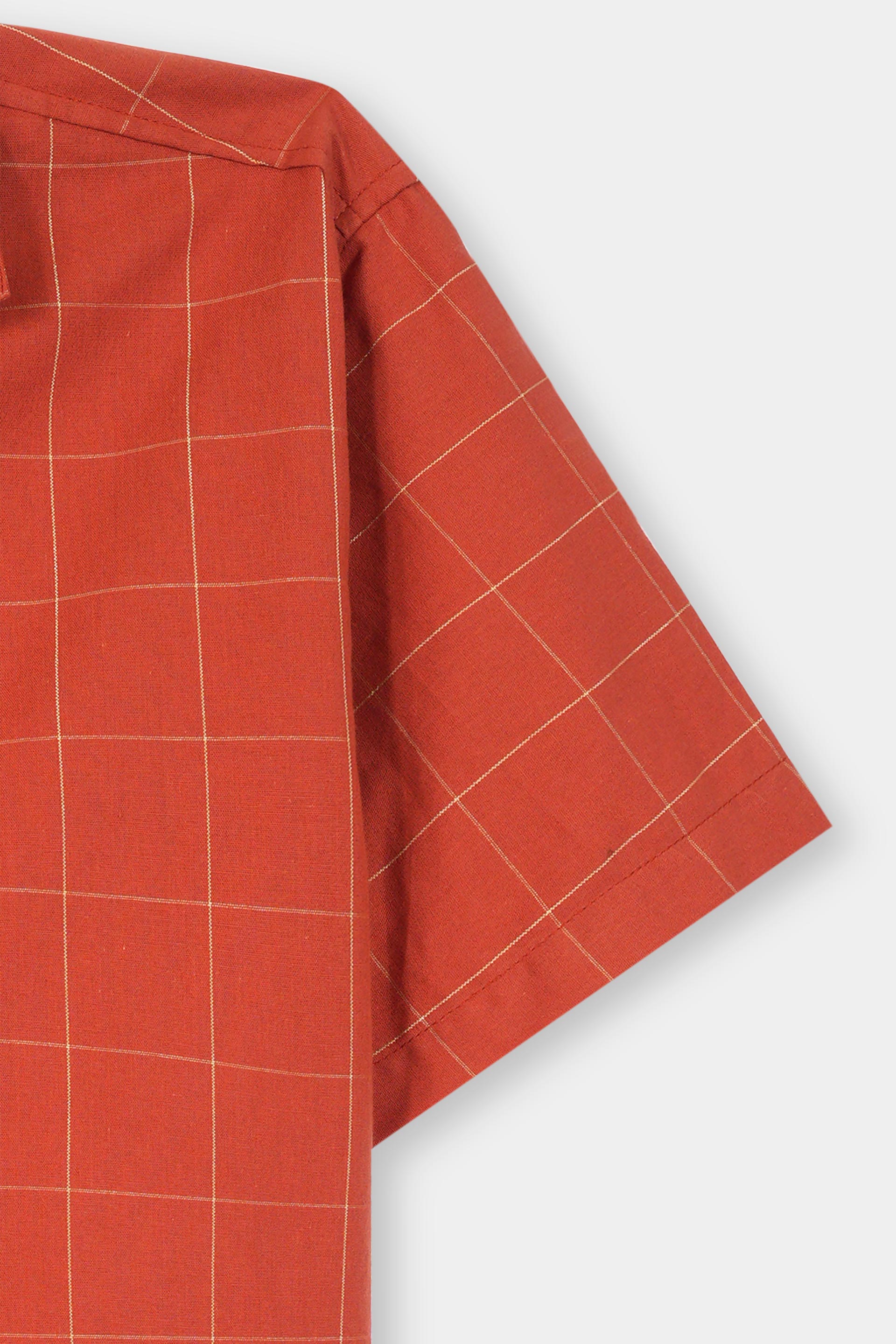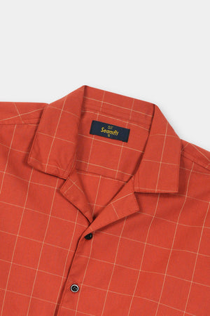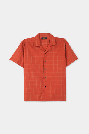 This half-sleeve Hawaiian shirt features a classic coat collar and is crafted from breathable cotton fabric, ensuring comfort and durability. Designed in a regular fit, it offers a relaxed yet tailored silhouette. The shirt showcases a distinctive orange and beige box pattern, adding a vibrant and stylish touch to your casual wardrobe. Ideal for warm weather, it combines traditional elements with contemporary design for versatile wear.