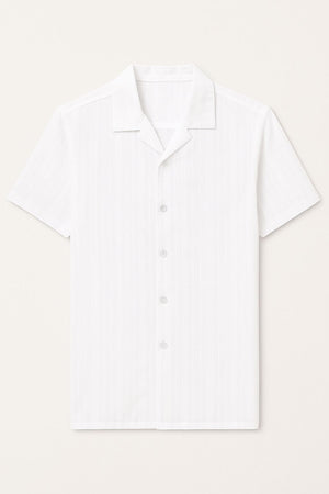 A summer essential, this white short-sleeve shirt is designed with subtle vertical textured stripes that add depth and elegance to its clean look. Featuring a camp collar, button-down front, and lightweight fabric, it delivers both comfort and style for casual or smart-casual occasions. Perfect for pairing with chinos, denim, or shorts.
